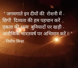 अतः हमें अंतर्मन के अंधेरों को भगाकर एक प्रकाश पुंज के साथ कल्याणकारी कार्यों के शरण में जाना होगा । हमारी निर्भयता , सहृदयता एवं उदारता का प्रतीक यह दीपक और उसकी निर्मल ज्योति हमें मदद करेगी देश को उज्ज्वल भविष्य के पथ पर अग्रसर होने के लिए । अग्नि अत्यंत पावन है और जब अग्नि अपना अंदर सम्पूर्ण शक्ति निहित कर एक छोटे से मिट्टी के दीये में समाती है तो इसकी शक्ति दुगुनी हो जाती है और हमारी अज्ञानता और सुप्त ज्ञानेन्द्रियों को जागृत करने का सामर्थ्य रखती है । बस जरूरत है तन और मन को शुद्ध कर ज्ञान के चक्षु खोल कर हमारे घर , समाज एवं देश की कल्याणकारी भावना के साथ दीपक जलाने की एकता की रौशनी फैलाने की ।